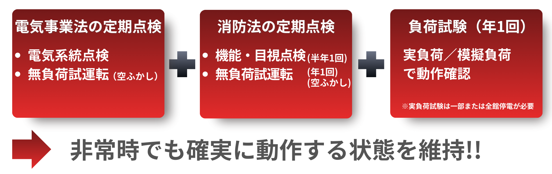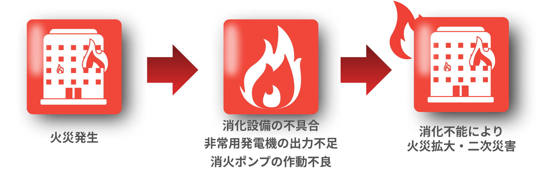 そのままの状態で非常用発電機を稼働させた場合、消化不能に陥るばかりか発電機のエンジントラブルによる新たな火災発生など二次災害の原因にもなります。